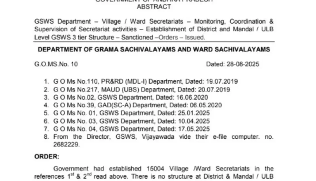 AP Grama Sachivalayam Notification 2025 ఆంధ్రప్రదేశ్ ప్రభుత్వం గ్రామ మరియు వార్డు సచివాలయాల పనితీరును బలోపేతం చేసేందుకు మరో పెద్ద అడుగు వేసింది. 28 ఆగస్టు 2025న విడుదలైన G.O.Ms.No.10 ప్రకారం, కొత్తగా 3-టియర్ వ్యవస్థ (District, Mandal, ULB స్థాయిలలో) ఏర్పాటు చేసింది. ఈ క్రమంలో మొత్తం 2,778 పోస్టులకు ఆమోదముద్ర వేసింది. ఇప్పటి వరకు సచివాలయాలు గ్రామ, వార్డు స్థాయిలకు మాత్రమే పరిమితమయ్యాయి. జిల్లా, మండల స్థాయిల్లో సమన్వయం లేకపోవడం వల్ల పనితీరులో కొన్ని సమస్యలు వచ్చాయి. ఈ సమస్యలను అధిగమించేందుకు కొత్త 3-టియర్ నిర్మాణం తీసుకొచ్చింది.