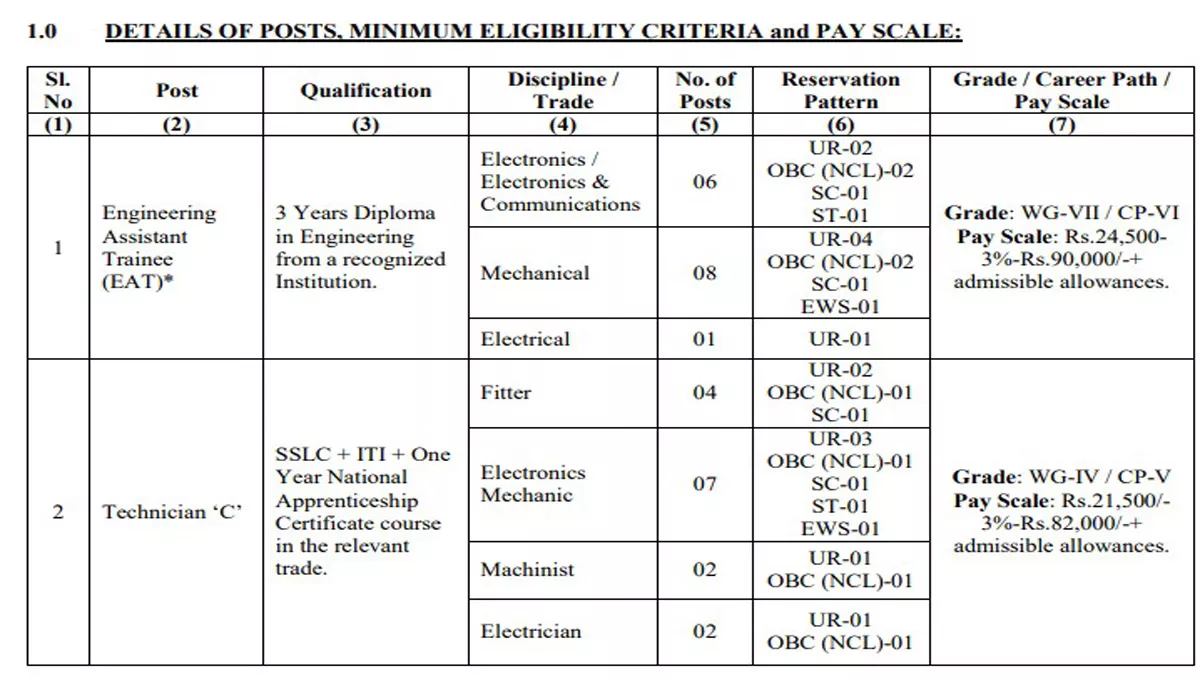 - టెక్నీషియన్ ‘సి’ : SSLC + ITI + ఒక సంవత్సరం అప్రెంటిస్ (లేదా) SSLC + సంబంధిత ట్రేడ్ లో 3 సంవత్సరాల NAC